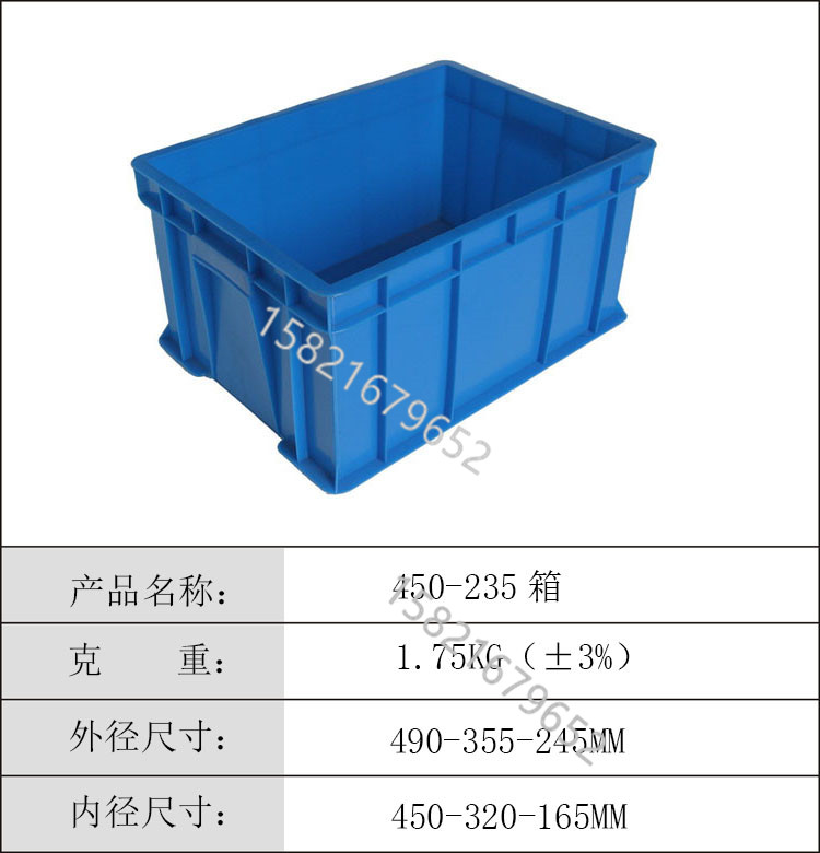 产品名称:450系列-235箱 外尺寸:490*355*245mm 内尺寸:450*320*235mm 克重:1750g